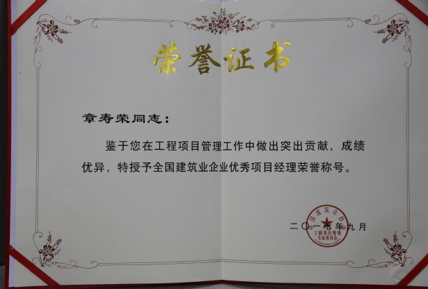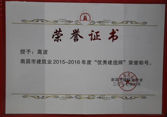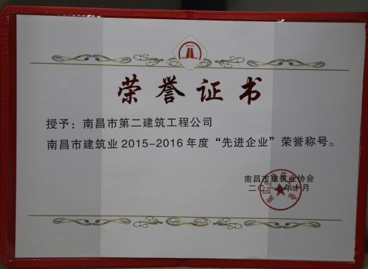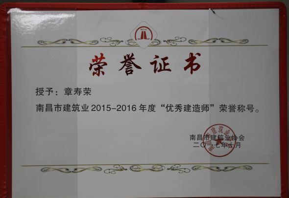 南昌市建筑業(yè)協(xié)會(huì)對(duì)公司頒發(fā)了南昌市建筑業(yè)2015-2016年度“先進(jìn)企業(yè)”榮譽(yù)稱號(hào),對(duì)公司建造師章壽榮、何靜、胡建平、高波頒發(fā)了南昌市建筑業(yè)2015-2016年度“優(yōu)秀建造師”榮譽(yù)稱號(hào);中國建筑業(yè)協(xié)會(huì)對(duì)章壽榮頒發(fā)了全國建筑業(yè)企業(yè)優(yōu)秀項(xiàng)目經(jīng)理榮譽(yù)稱號(hào)。